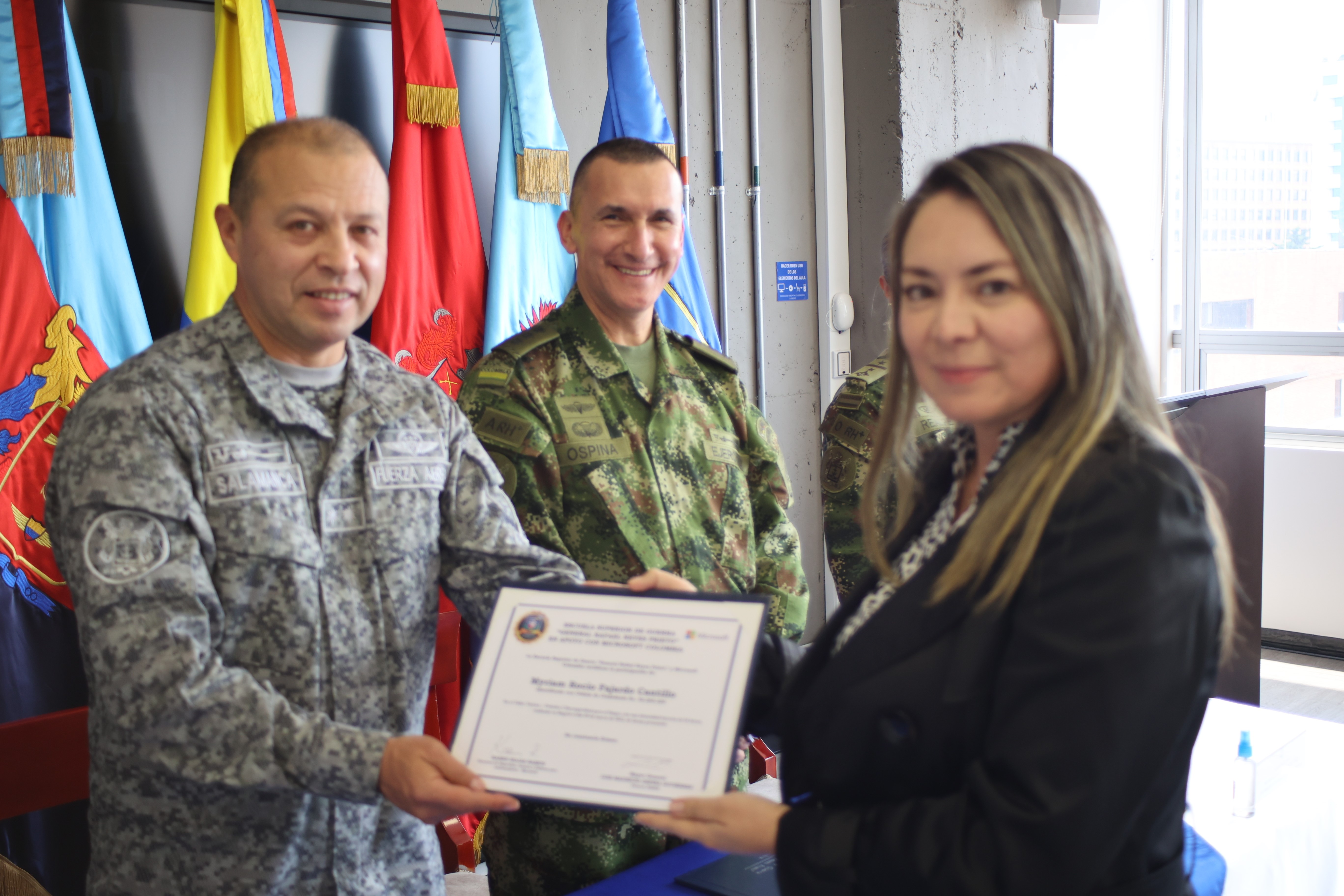 Después de la jornada de trabajo teórico-práctica, concluyó el evento con la entrega de los diplomas a las 18 graduandas, certificando su participación en el Taller “Ciberseguridad en el hogar” realizado en Bogotá, D.C., el día 09 de marzo de 2022 de forma presencial con una intensidad de 4 horas y firmado por la doctora Karen Rojas Ramos, directora de Seguridad, Justicia y Defensa LATAM Microsoft y el Mayor General Luis Mauricio Ospina Gutiérrez, director ESDEG.